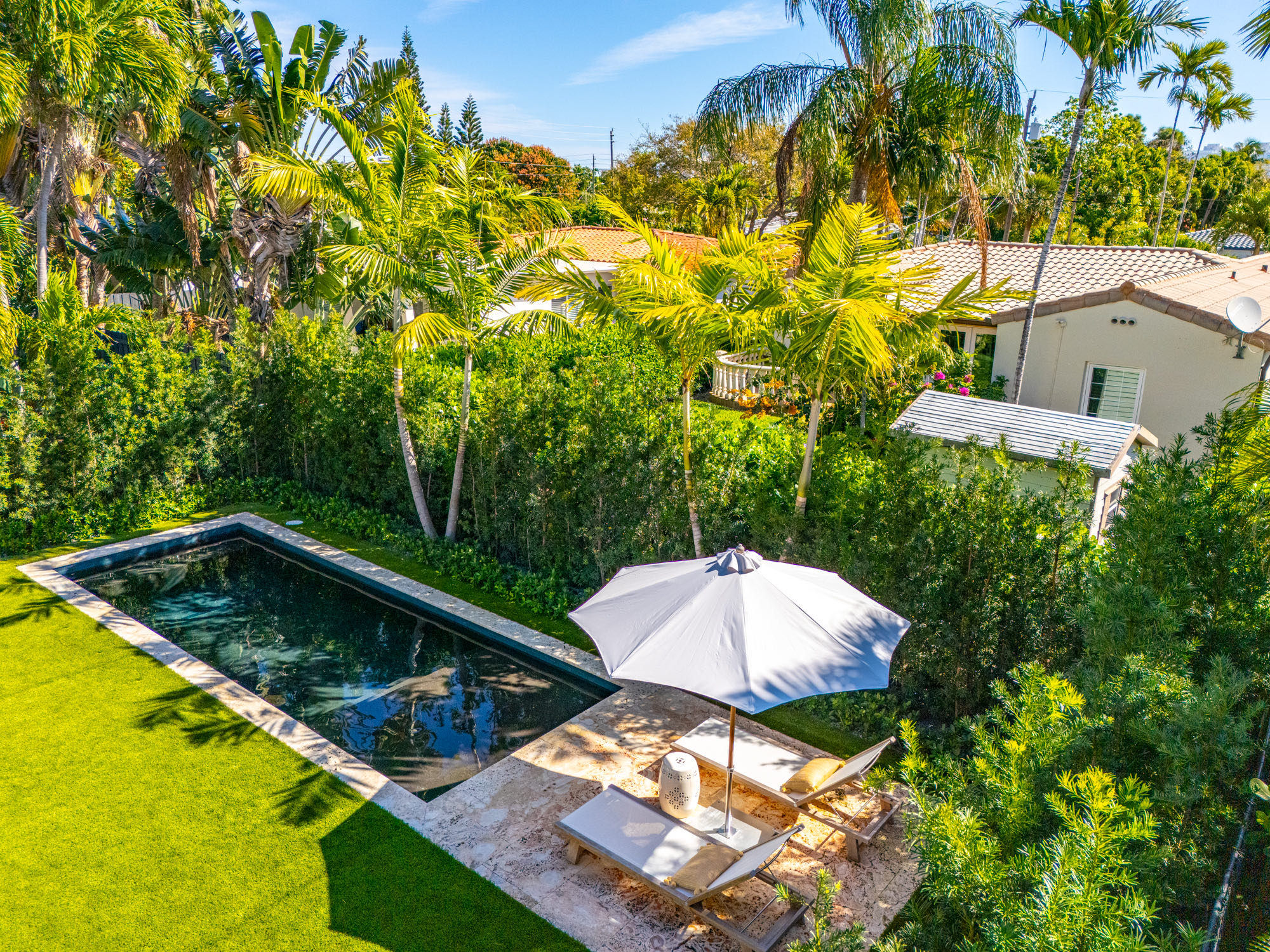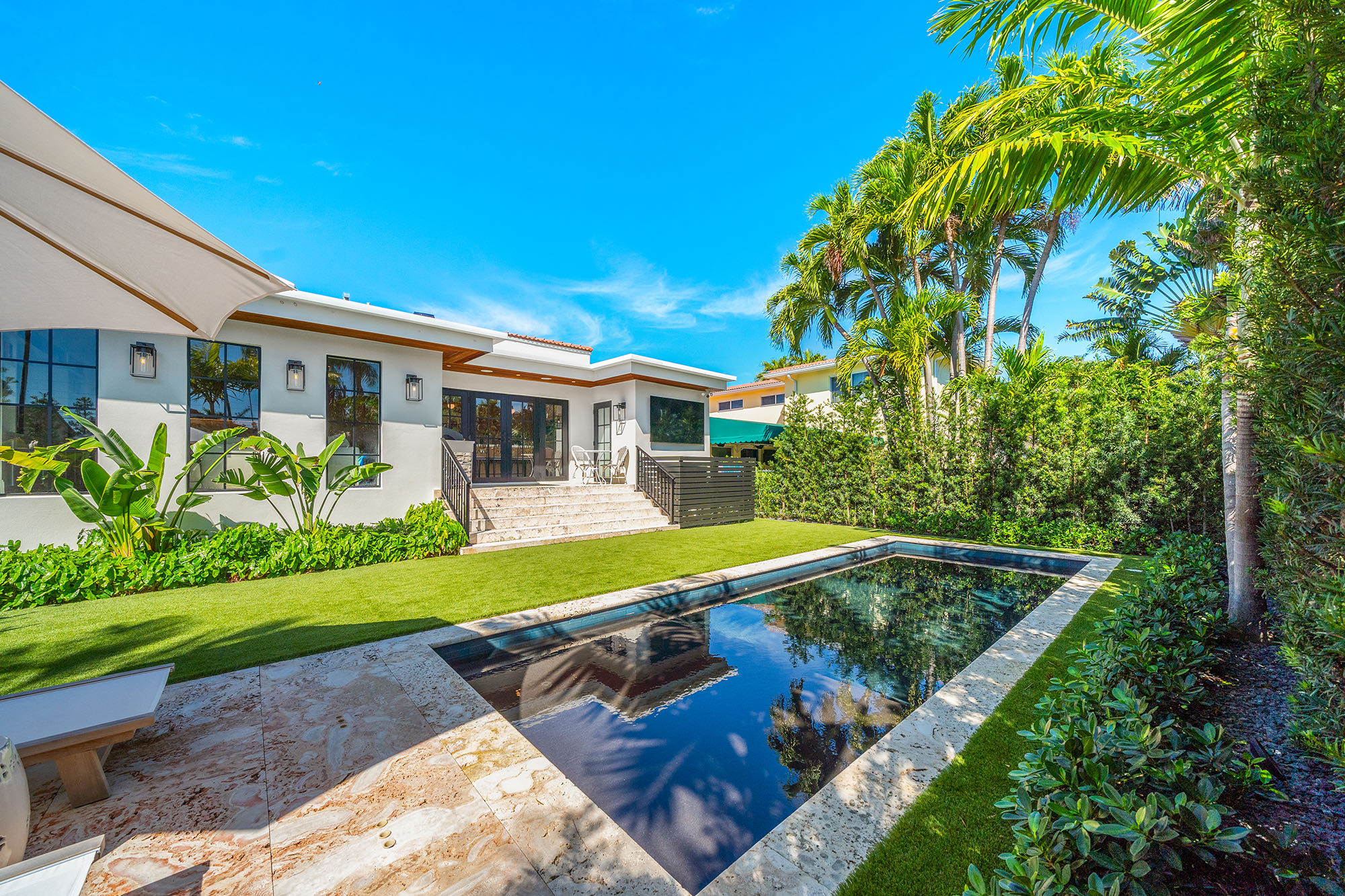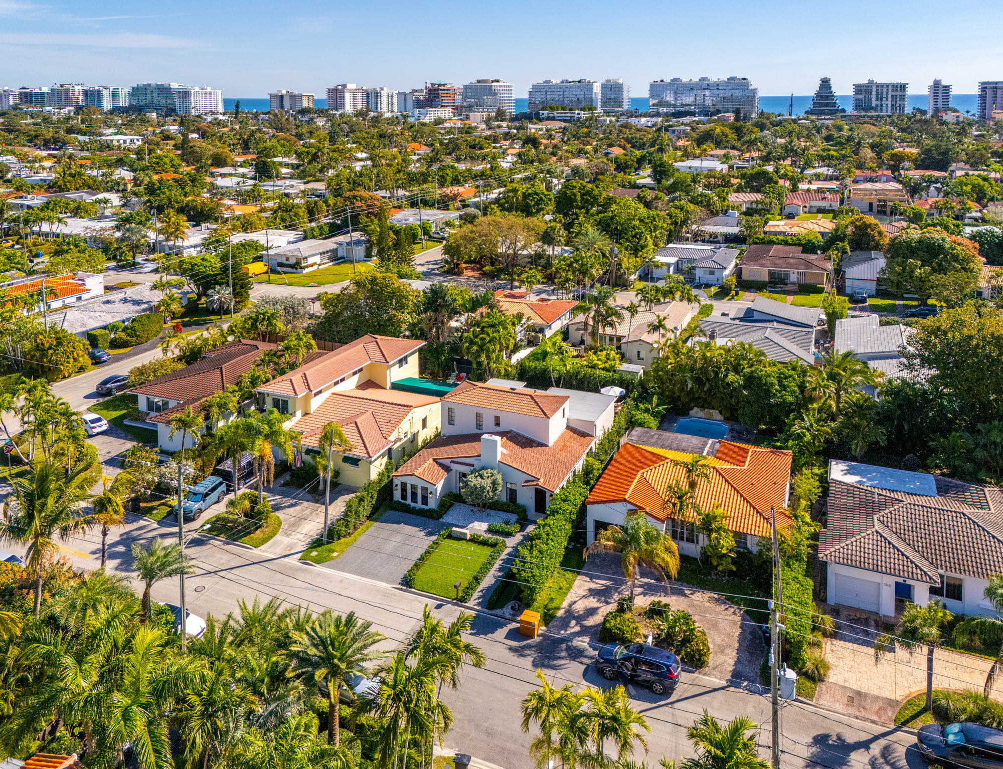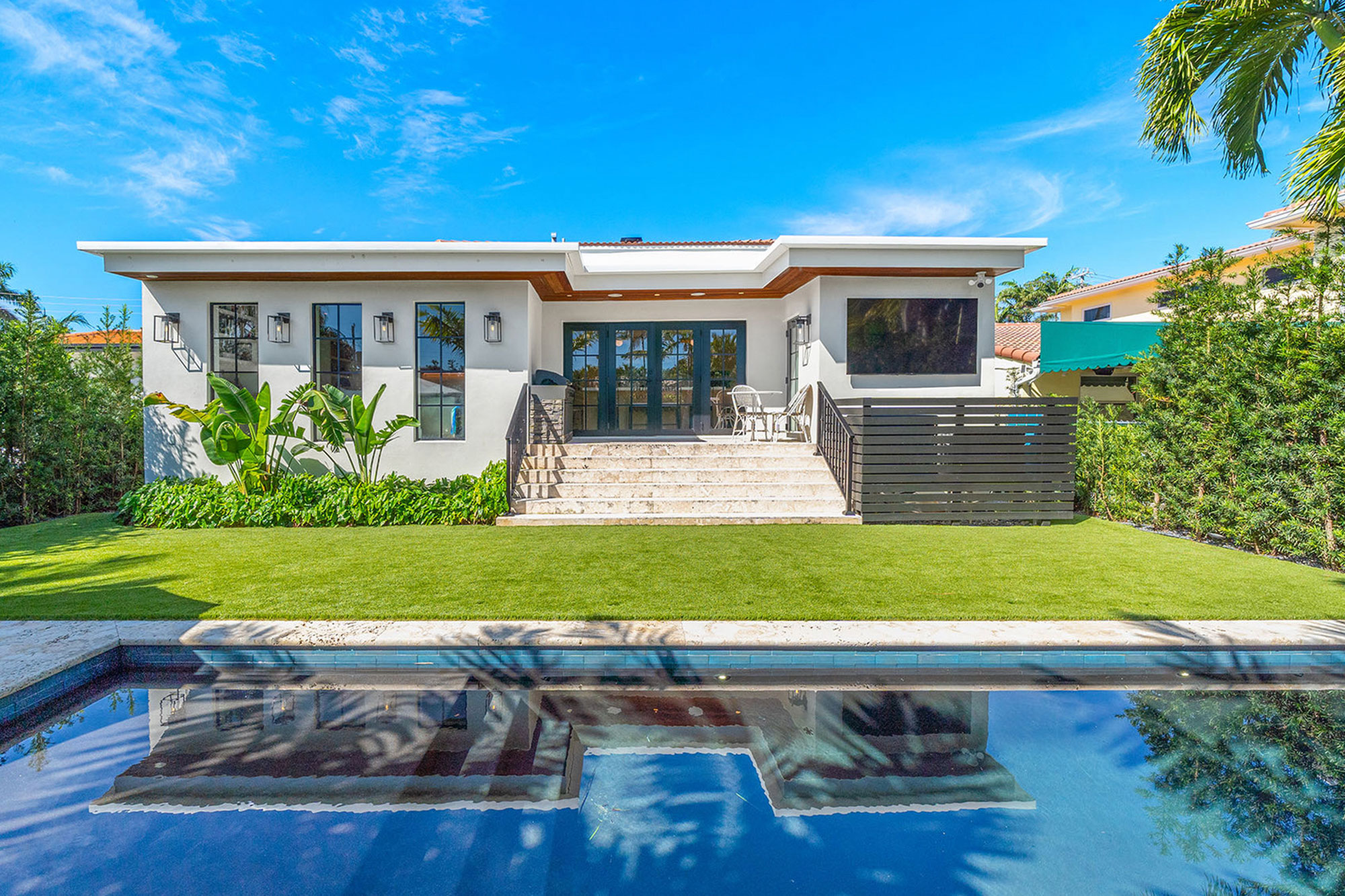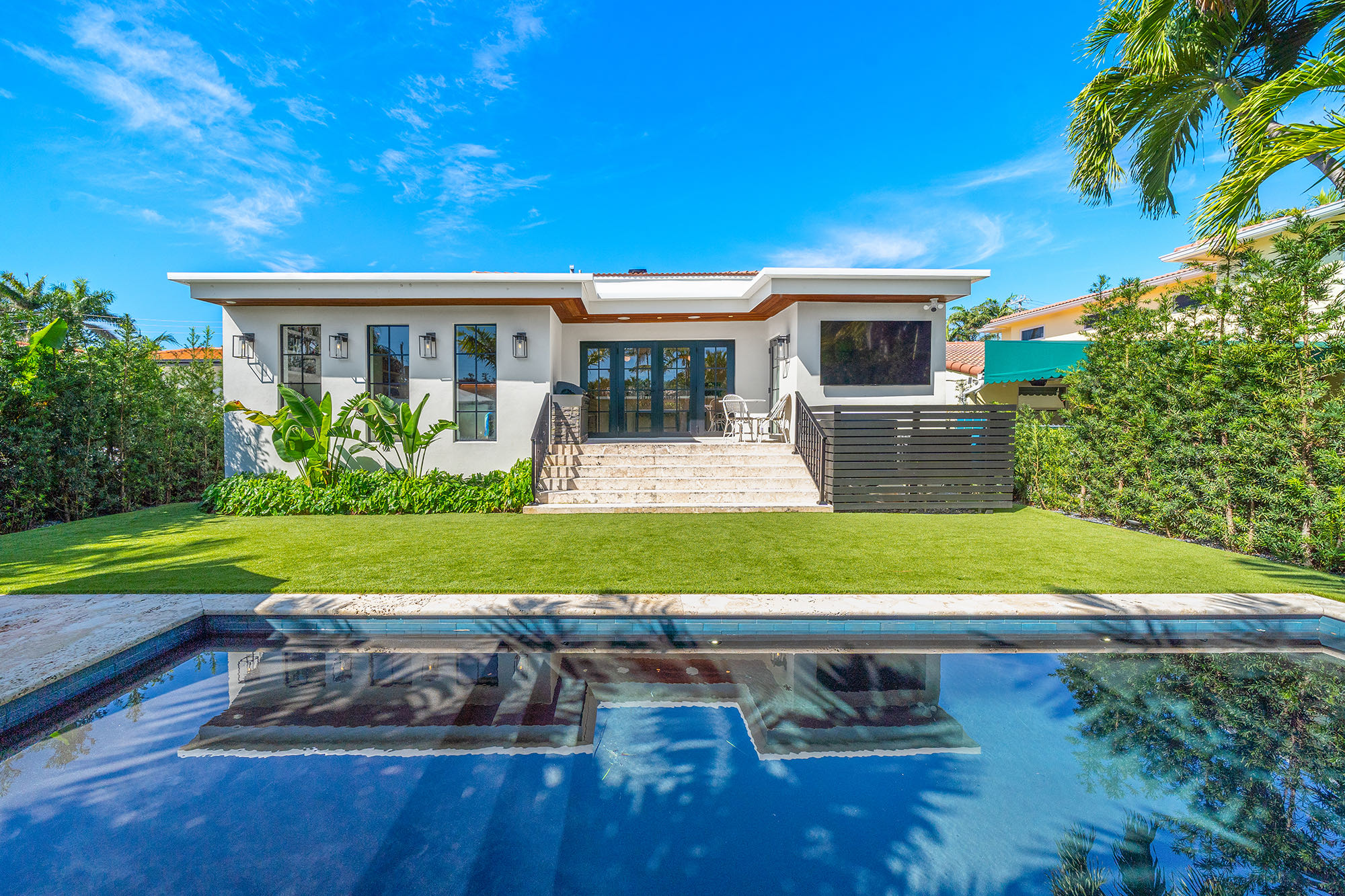 This spacious, fully remodeled two-story home (2,681 SF) blends modern elegance with high-end finishes. Filled with natural light, it features 3 bedrooms, 3 updated bathrooms, hardwood floors, porcelain tile in the hallway, terrazzo tile in the nursery bathroom, and Florida shellstone in the master bathroom. Redone in 2023 with new electrical, HVAC, plumbing, pool, and flat roof. Luxury touches include Italian doors, Ralph Lauren curtains, Sonos sound, and a marble kitchen island. The quartzite kitchen flows into the dining area, overlooking a fruit tree garden. French doors open to a deck & backyard with a pool and barbecue. Features security cameras, impact windows, landscape lighting, artificial turf & sprinkler system. Near the beach, Bal Harbour & A-rated Bay Harbor Schools.