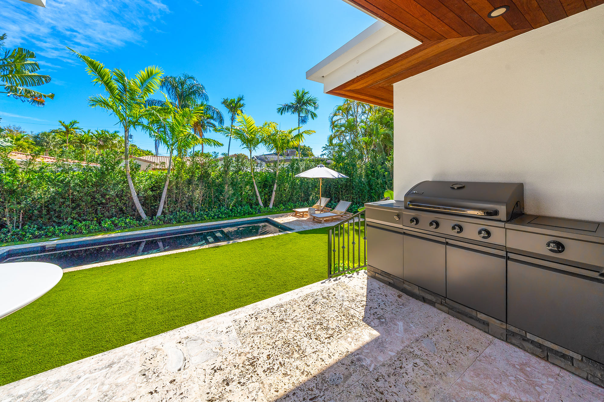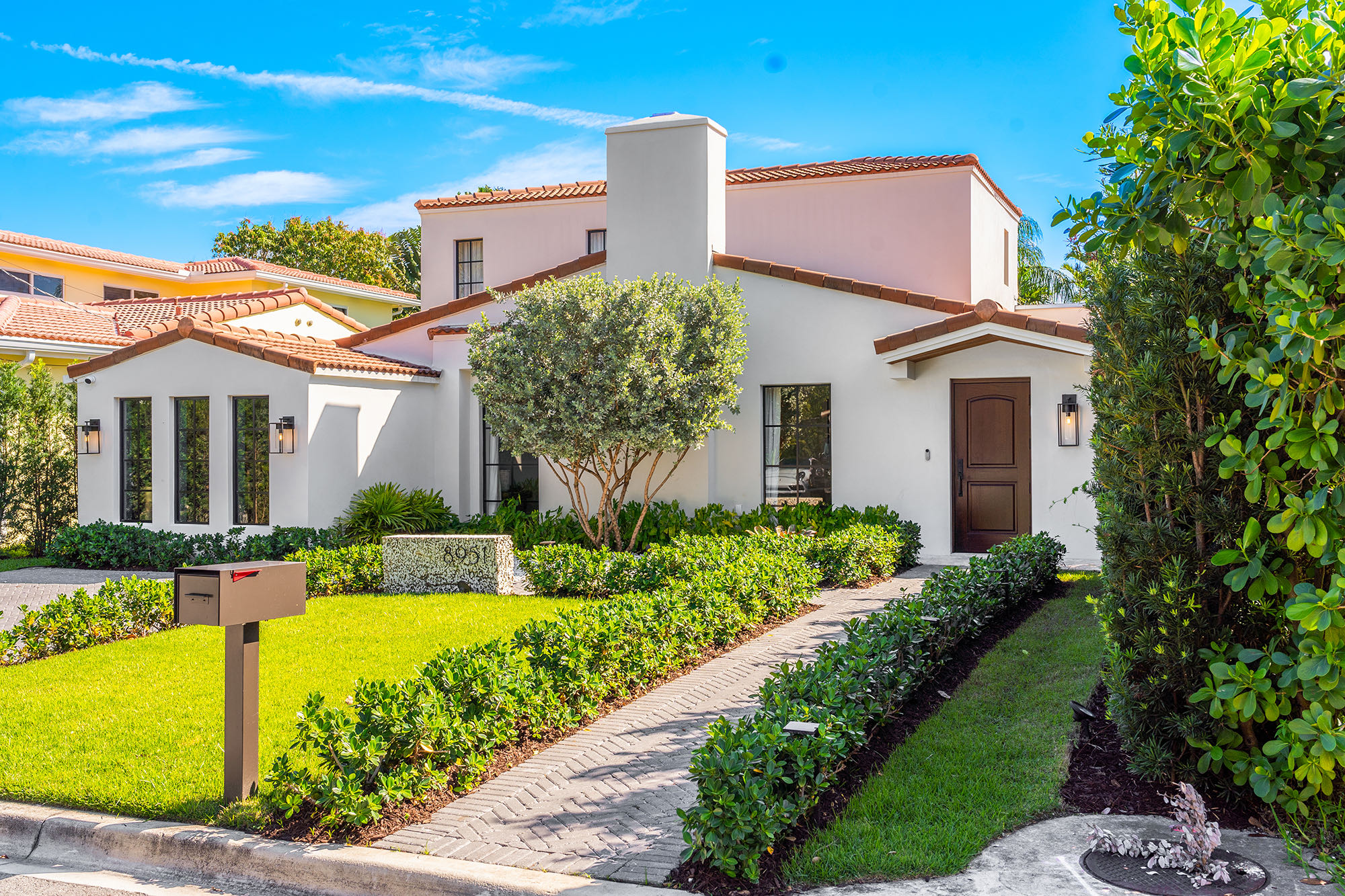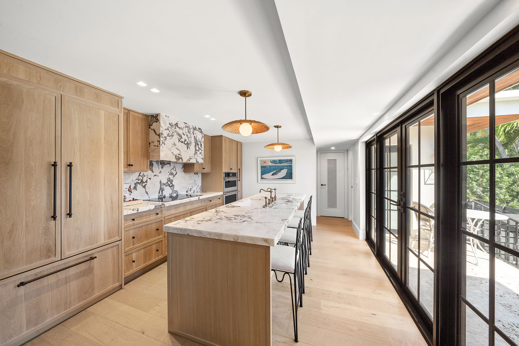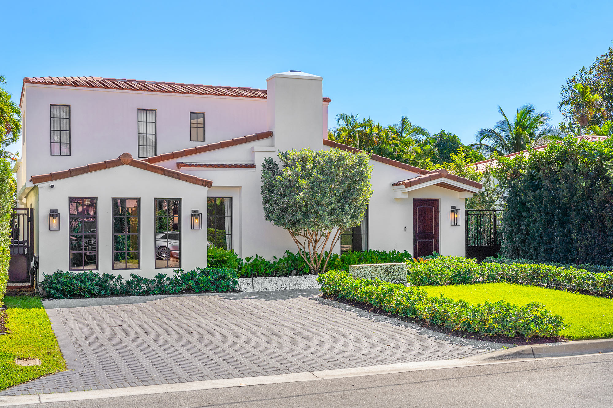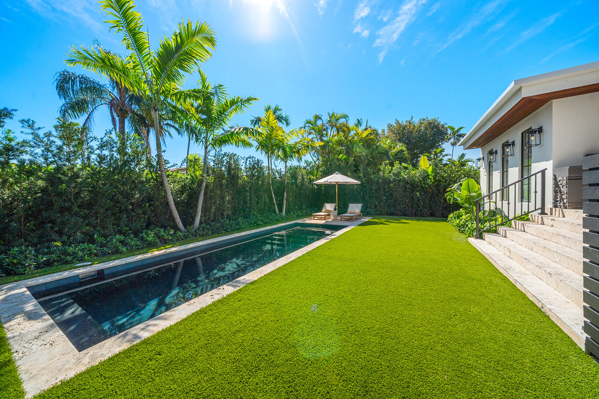 This spacious, fully remodeled two-story home (2,681 SF) blends modern elegance with high-end finishes. Filled with natural light, it features 3 bedrooms, 3 updated bathrooms, hardwood floors, porcelain tile in the hallway, terrazzo tile in the nursery bathroom, and Florida shellstone in the master bathroom. Redone in 2023 with new electrical, HVAC, plumbing, pool, and flat roof. Luxury touches include Italian doors, Ralph Lauren curtains, Sonos sound, and a marble kitchen island. The quartzite kitchen flows into the dining area, overlooking a fruit tree garden. French doors open to a deck & backyard with a pool and barbecue. Features security cameras, impact windows, landscape lighting, artificial turf & sprinkler system. Near the beach, Bal Harbour & A-rated Bay Harbor Schools.
