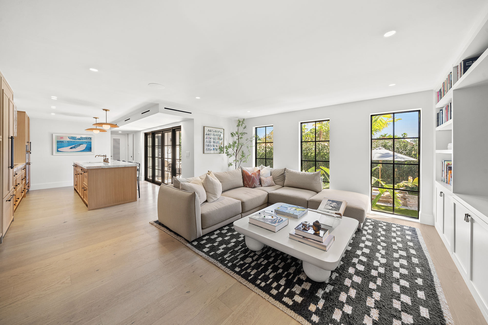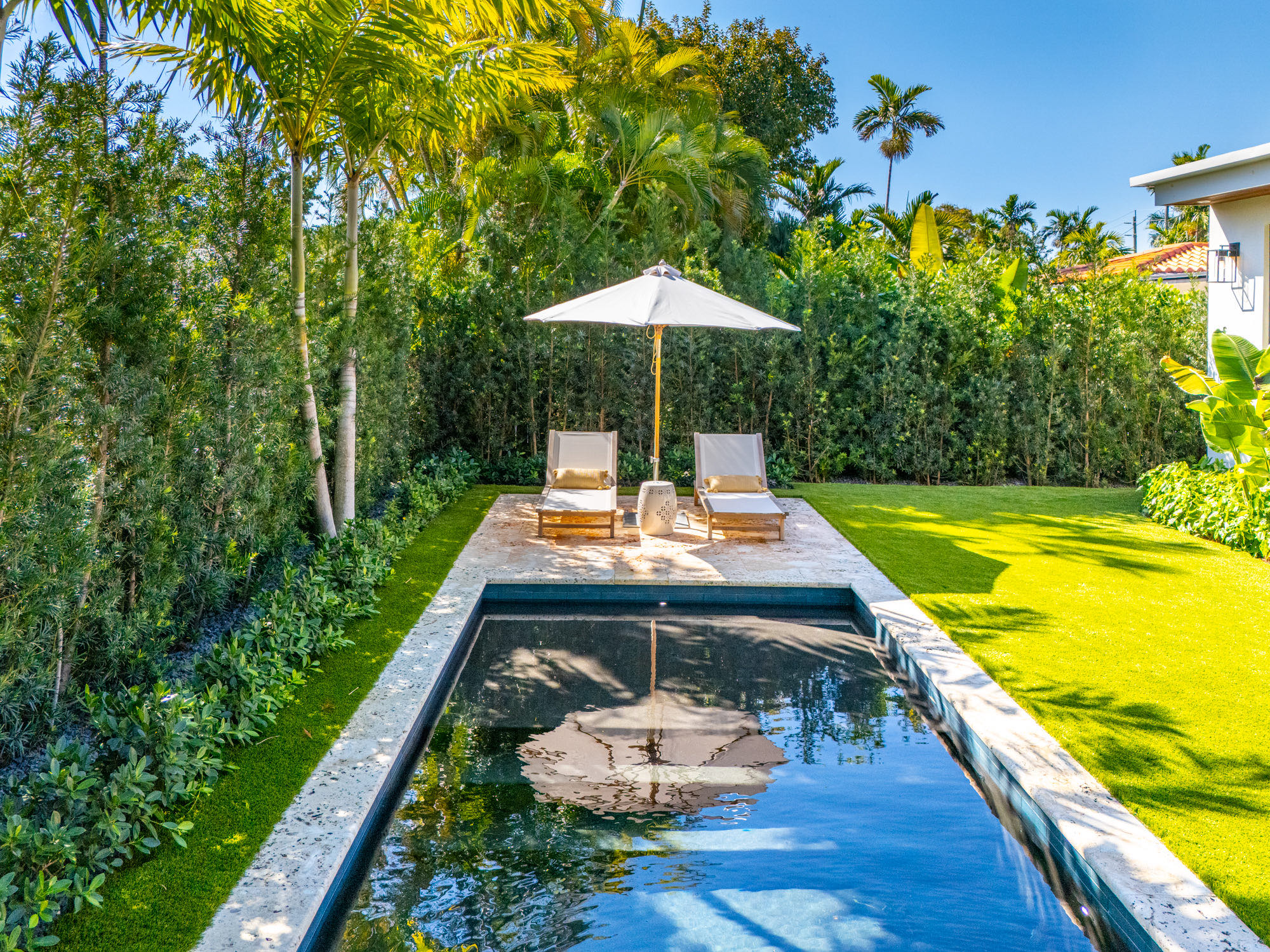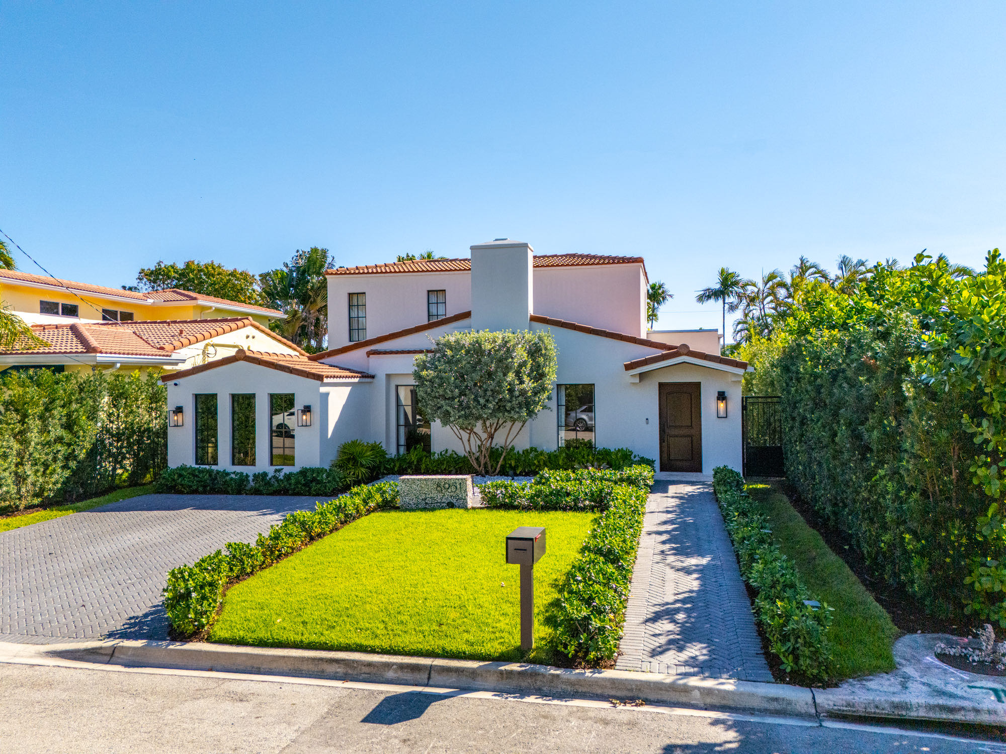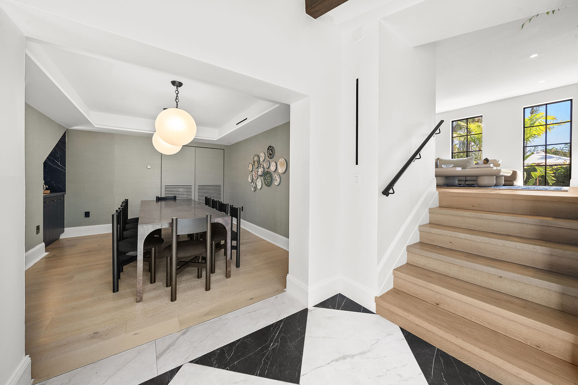 This spacious, fully remodeled two-story home (2,681 SF) blends modern elegance with high-end finishes. Filled with natural light, it features 3 bedrooms, 3 updated bathrooms, hardwood floors, porcelain tile in the hallway, terrazzo tile in the nursery bathroom, and Florida shellstone in the master bathroom. Redone in 2023 with new electrical, HVAC, plumbing, pool, and flat roof. Luxury touches include Italian doors, Ralph Lauren curtains, Sonos sound, and a marble kitchen island. The quartzite kitchen flows into the dining area, overlooking a fruit tree garden. French doors open to a deck & backyard with a pool and barbecue. Features security cameras, impact windows, landscape lighting, artificial turf & sprinkler system. Near the beach, Bal Harbour & A-rated Bay Harbor Schools.