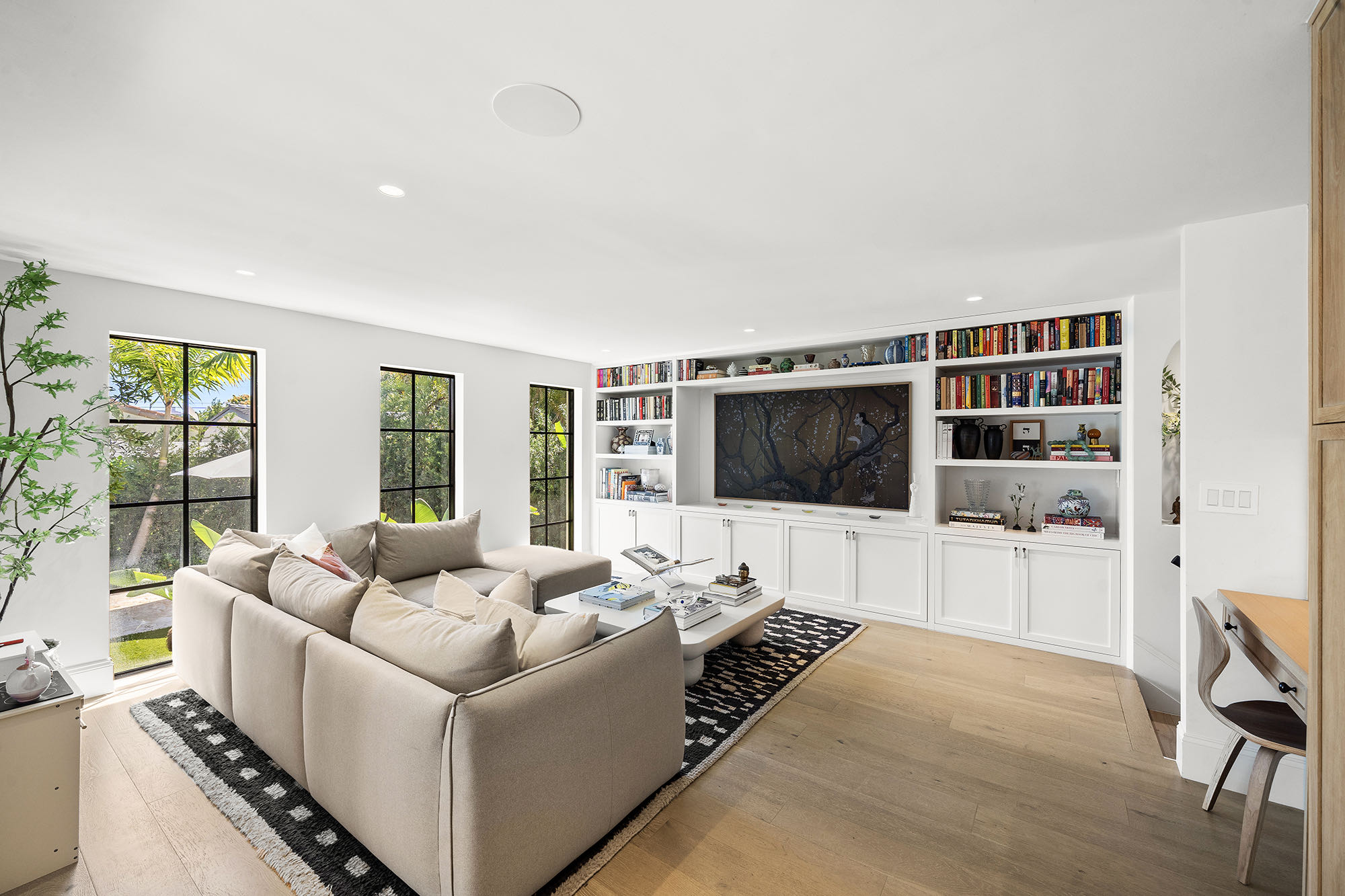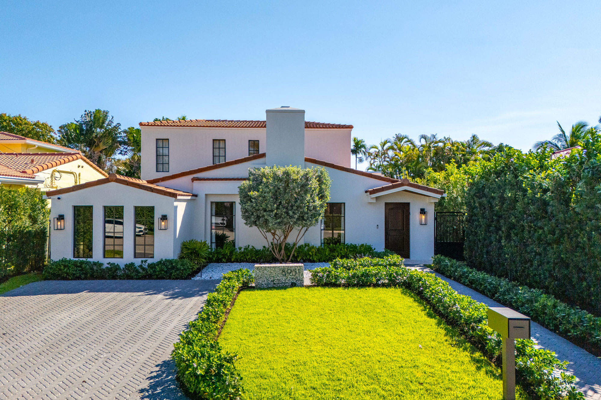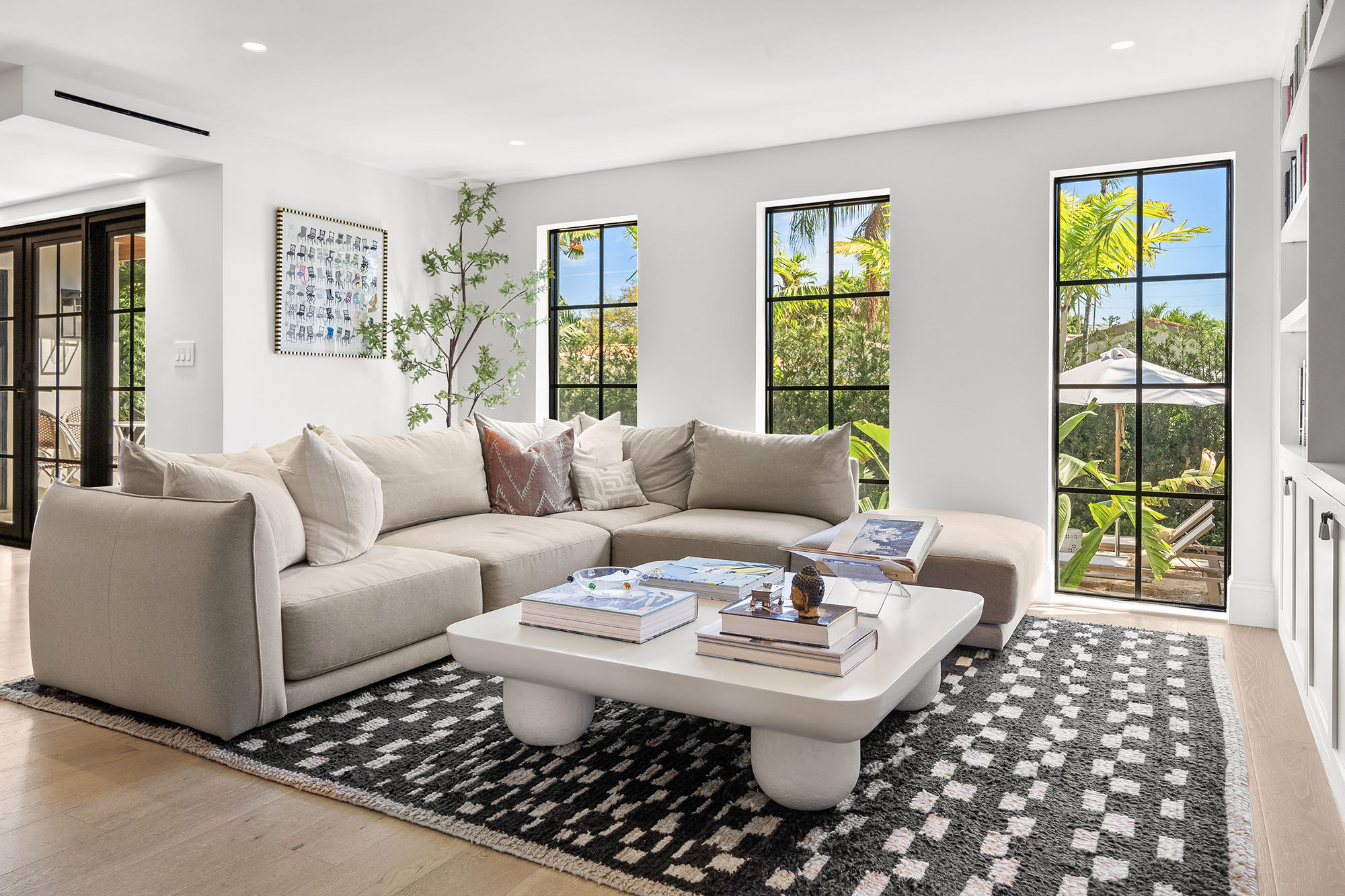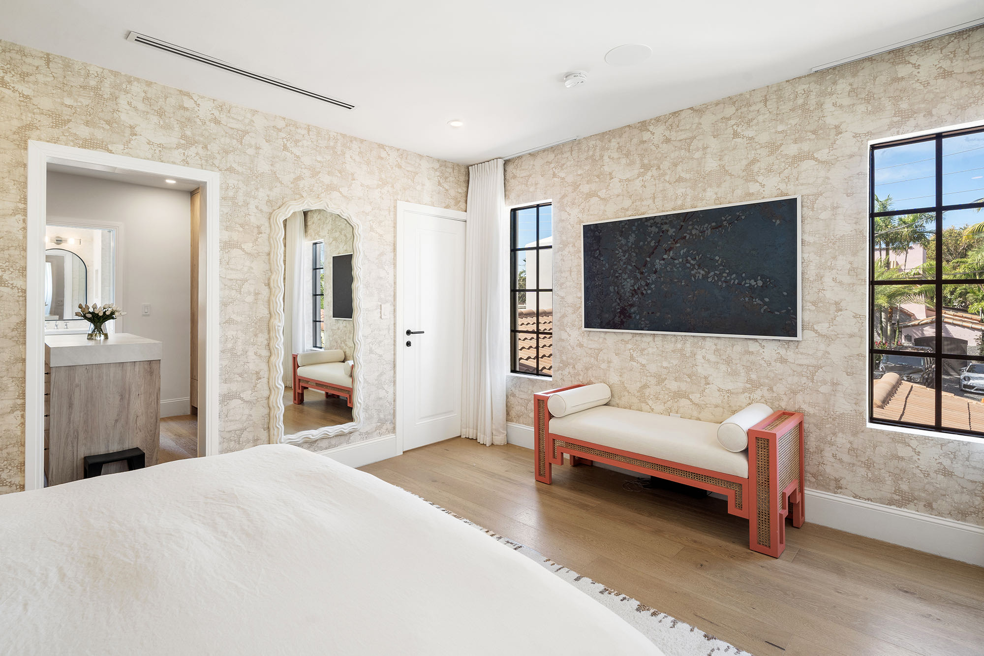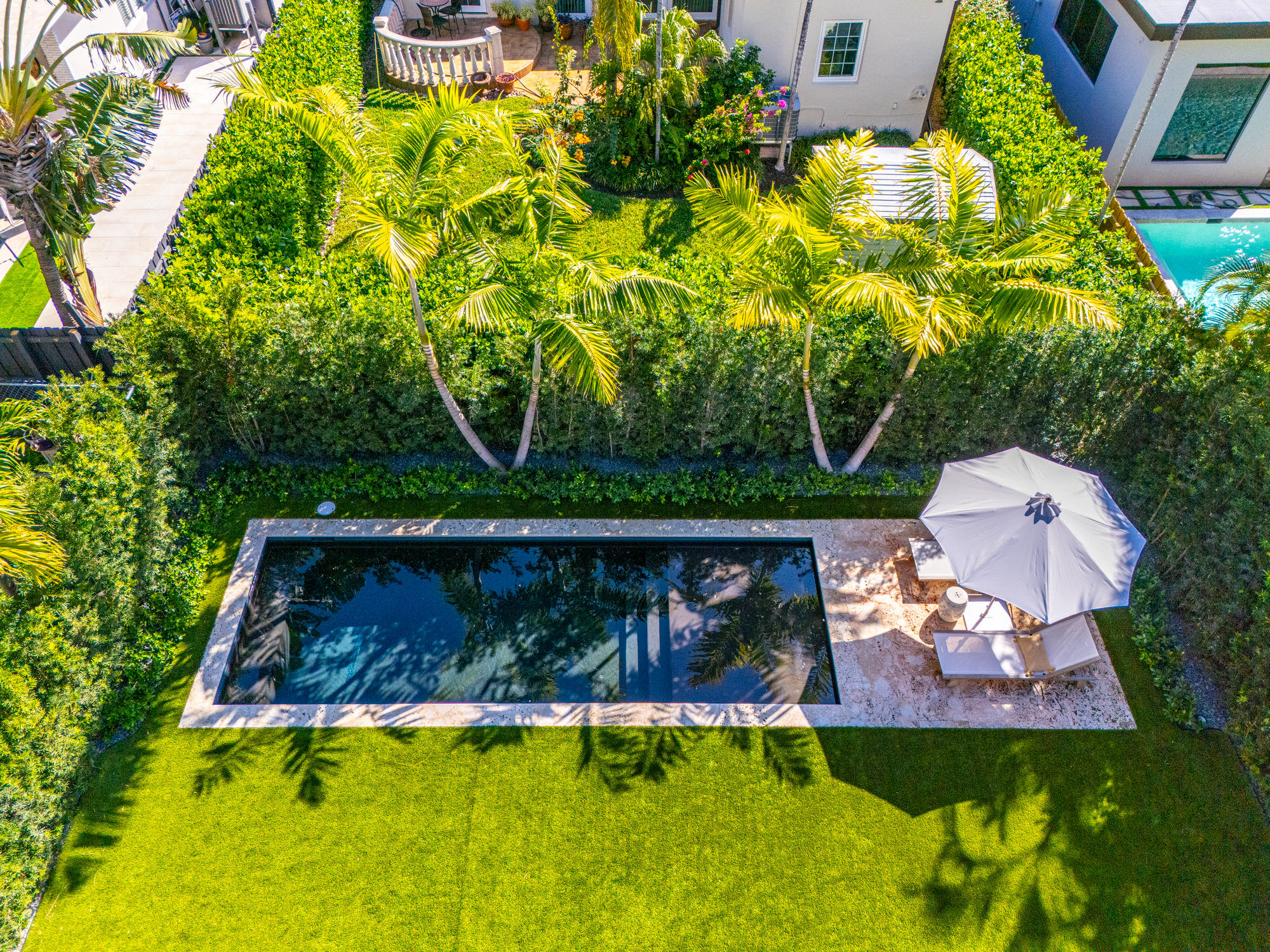 This spacious, fully remodeled two-story home (2,681 SF) blends modern elegance with high-end finishes. Filled with natural light, it features 3 bedrooms, 3 updated bathrooms, hardwood floors, porcelain tile in the hallway, terrazzo tile in the nursery bathroom, and Florida shellstone in the master bathroom. Redone in 2023 with new electrical, HVAC, plumbing, pool, and flat roof. Luxury touches include Italian doors, Ralph Lauren curtains, Sonos sound, and a marble kitchen island. The quartzite kitchen flows into the dining area, overlooking a fruit tree garden. French doors open to a deck & backyard with a pool and barbecue. Features security cameras, impact windows, landscape lighting, artificial turf & sprinkler system. Near the beach, Bal Harbour & A-rated Bay Harbor Schools.