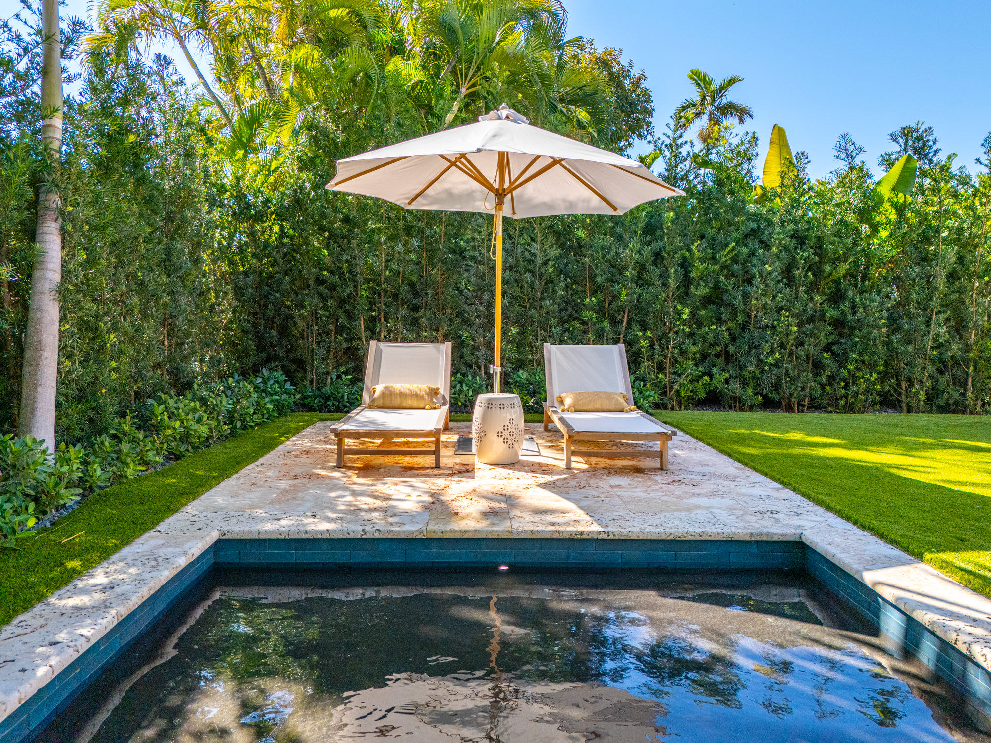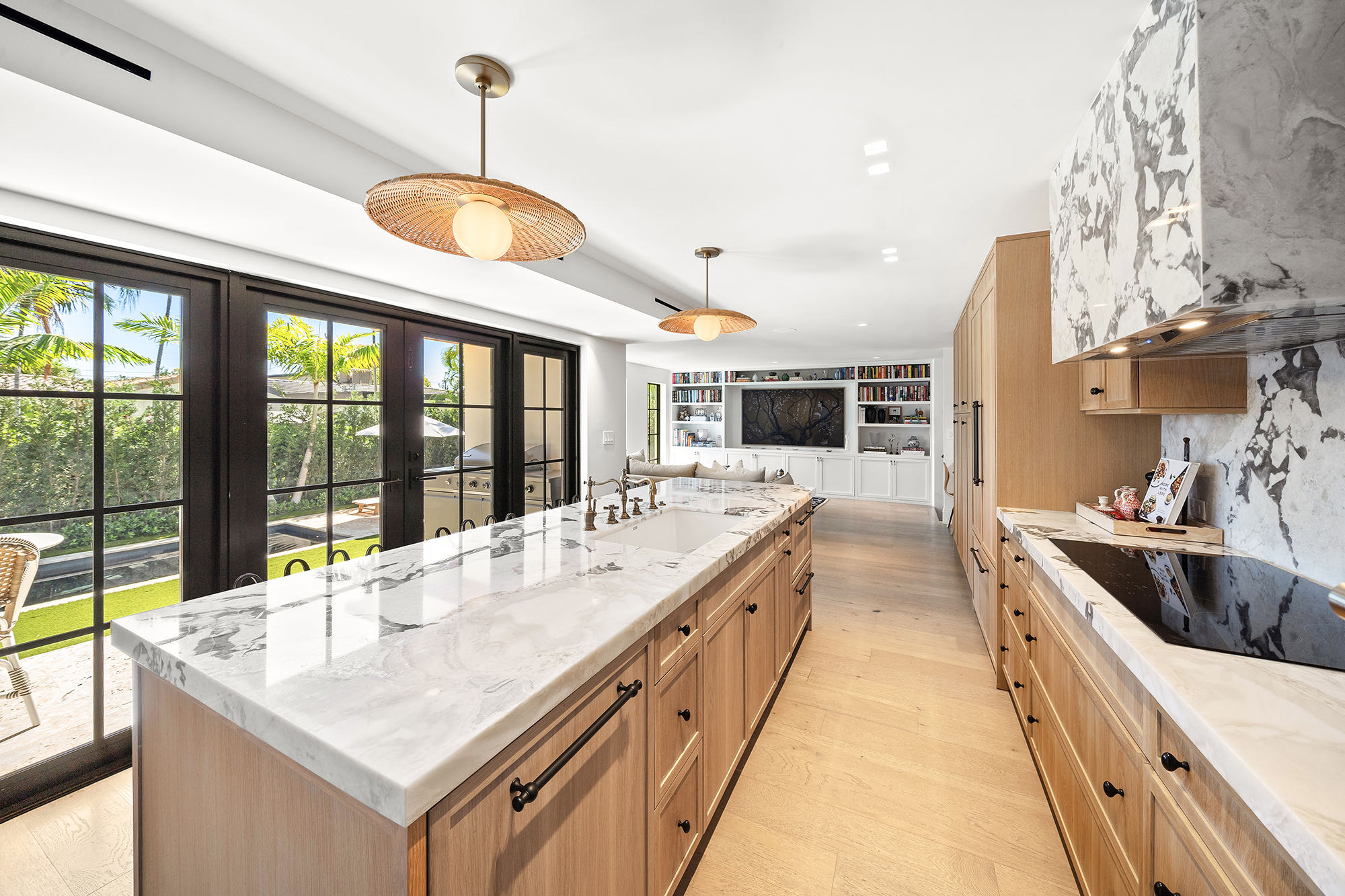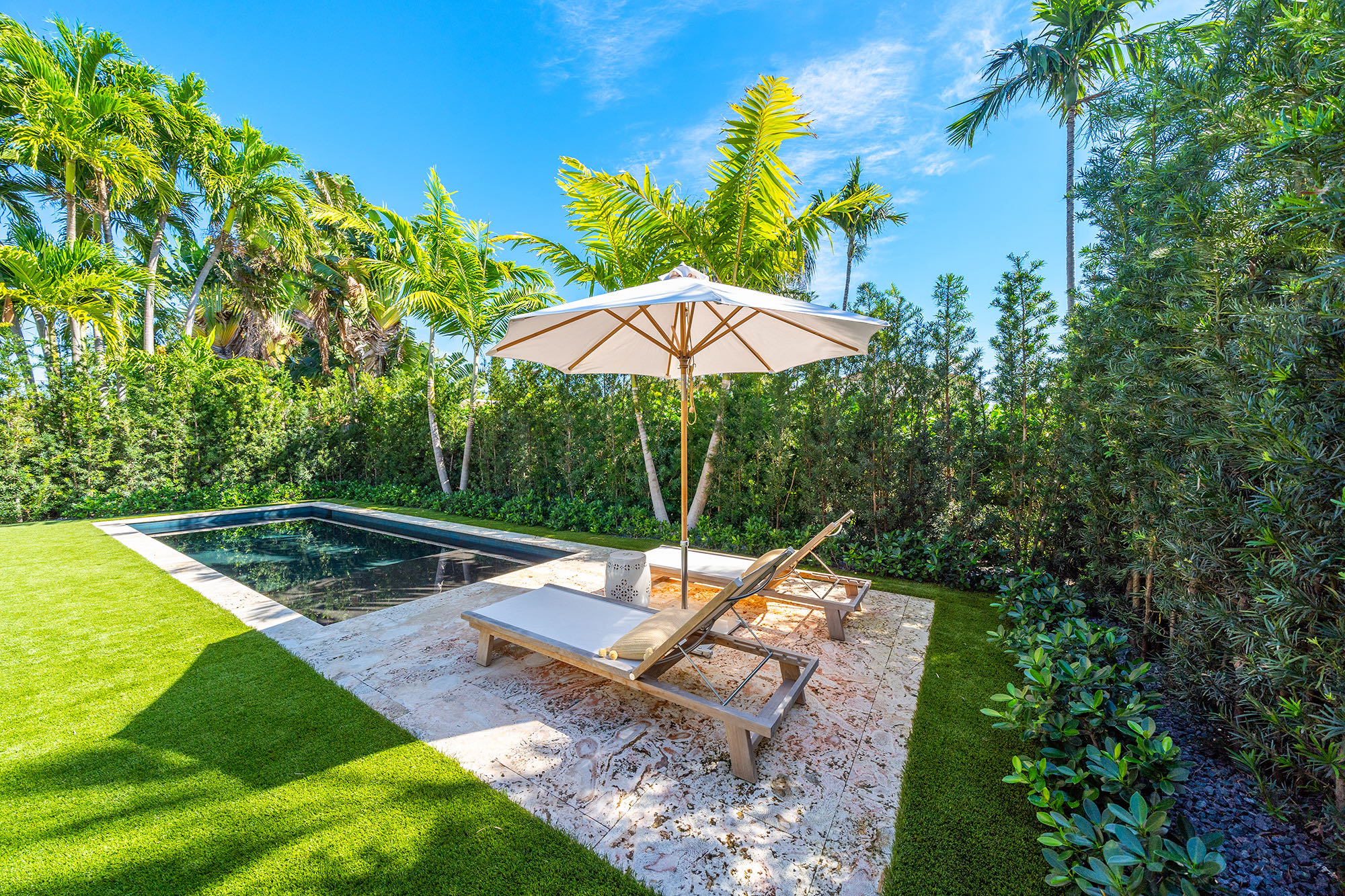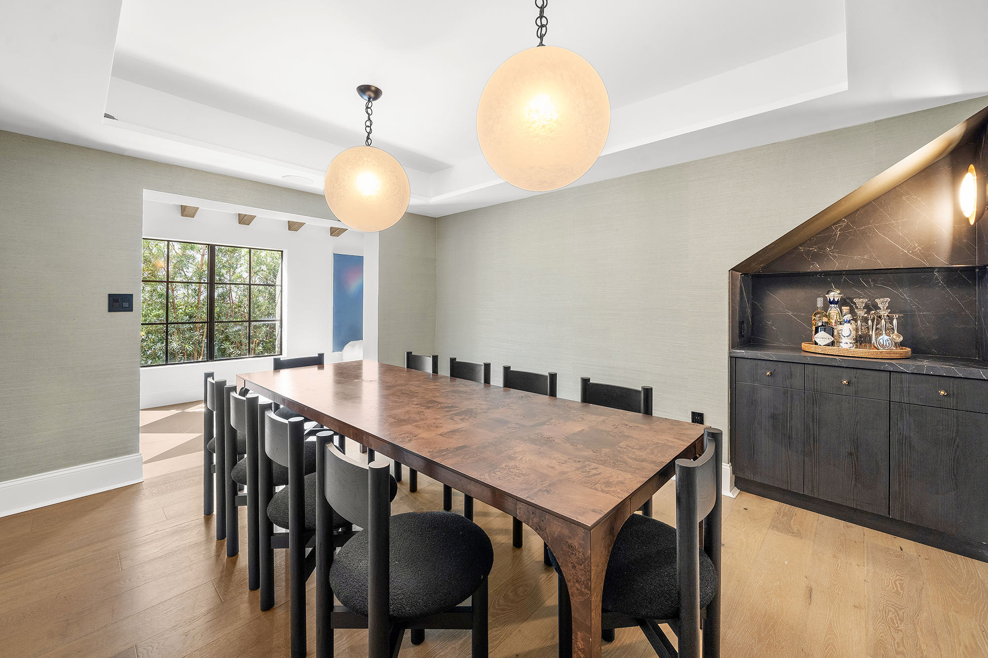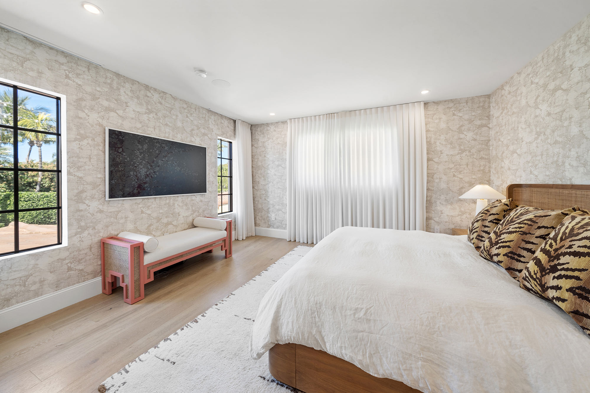 This spacious, fully remodeled two-story home (2,681 SF) blends modern elegance with high-end finishes. Filled with natural light, it features 3 bedrooms, 3 updated bathrooms, hardwood floors, porcelain tile in the hallway, terrazzo tile in the nursery bathroom, and Florida shellstone in the master bathroom. Redone in 2023 with new electrical, HVAC, plumbing, pool, and flat roof. Luxury touches include Italian doors, Ralph Lauren curtains, Sonos sound, and a marble kitchen island. The quartzite kitchen flows into the dining area, overlooking a fruit tree garden. French doors open to a deck & backyard with a pool and barbecue. Features security cameras, impact windows, landscape lighting, artificial turf & sprinkler system. Near the beach, Bal Harbour & A-rated Bay Harbor Schools.