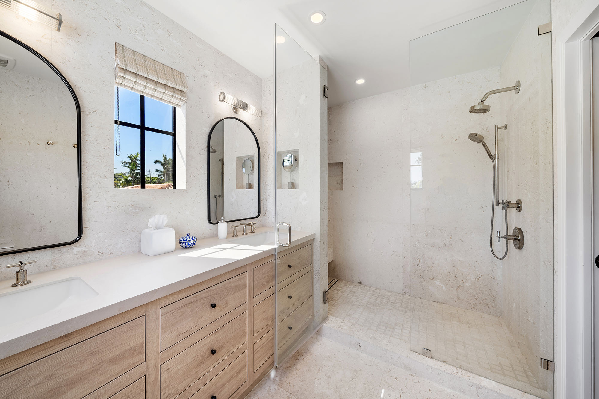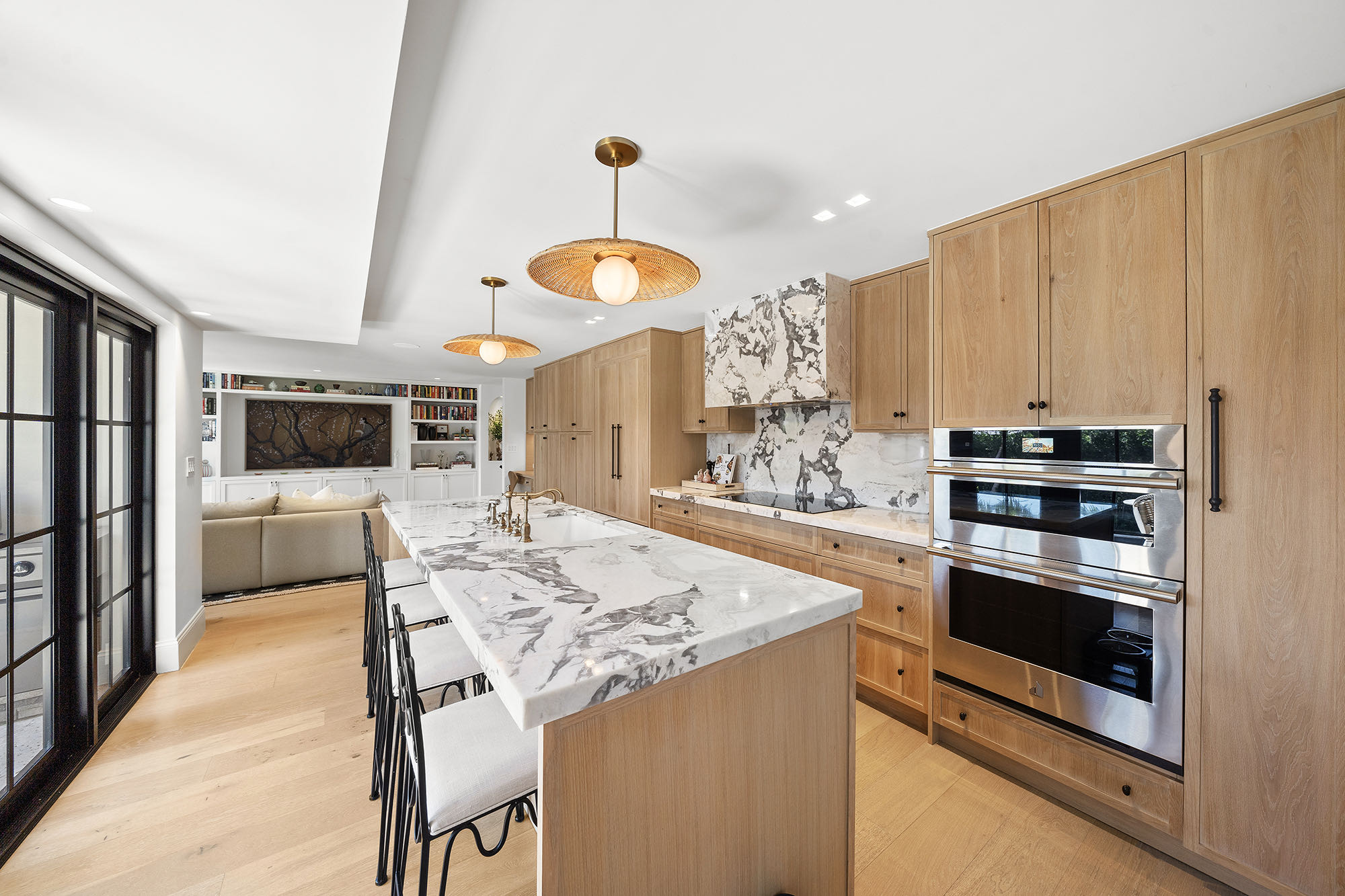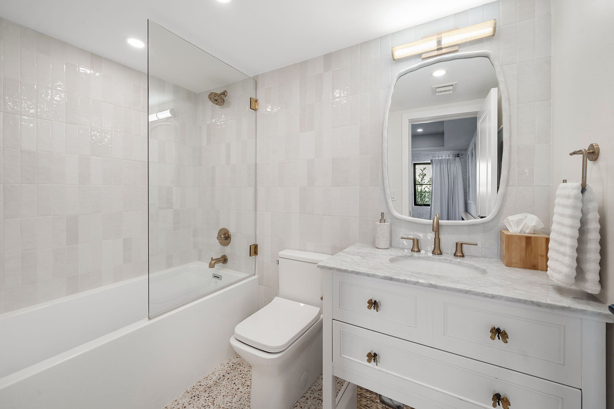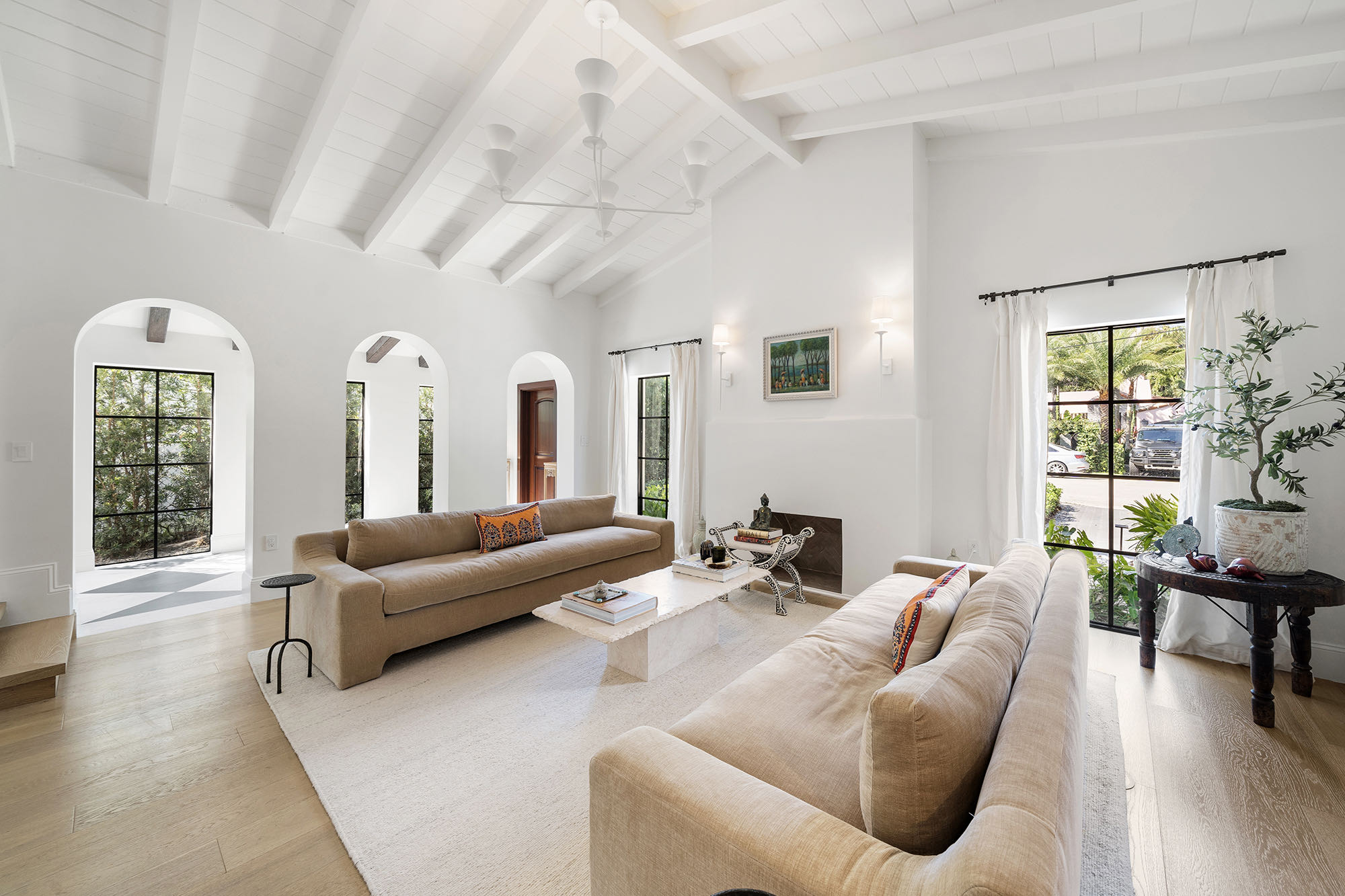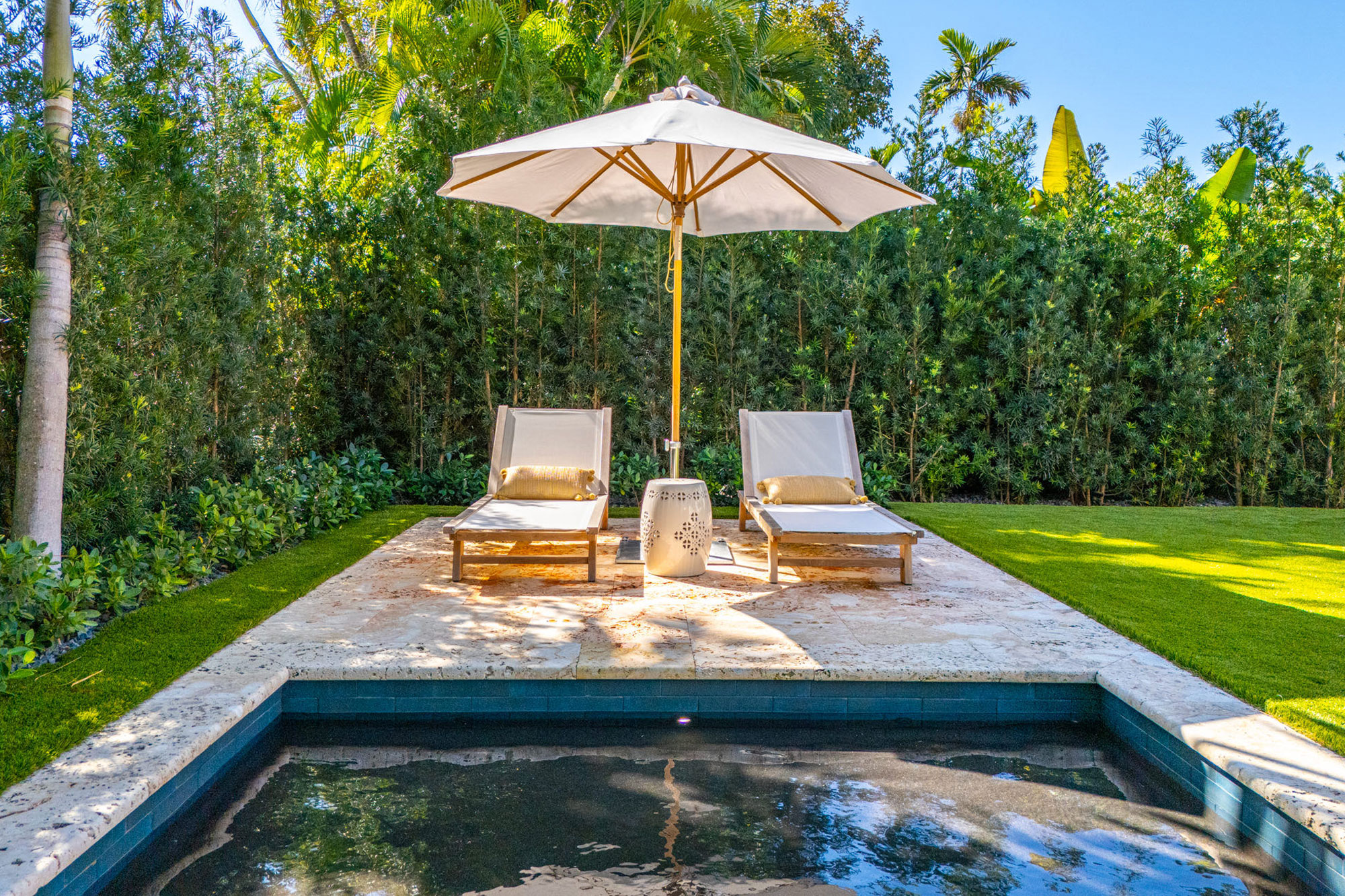 This spacious, fully remodeled two-story home (2,681 SF) blends modern elegance with high-end finishes. Filled with natural light, it features 3 bedrooms, 3 updated bathrooms, hardwood floors, porcelain tile in the hallway, terrazzo tile in the nursery bathroom, and Florida shellstone in the master bathroom. Redone in 2023 with new electrical, HVAC, plumbing, pool, and flat roof. Luxury touches include Italian doors, Ralph Lauren curtains, Sonos sound, and a marble kitchen island. The quartzite kitchen flows into the dining area, overlooking a fruit tree garden. French doors open to a deck & backyard with a pool and barbecue. Features security cameras, impact windows, landscape lighting, artificial turf & sprinkler system. Near the beach, Bal Harbour & A-rated Bay Harbor Schools.