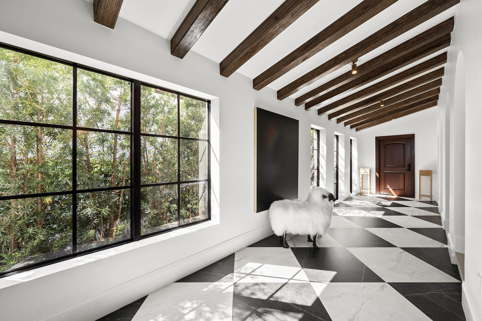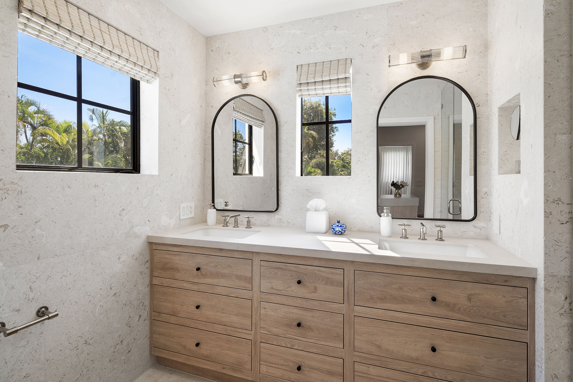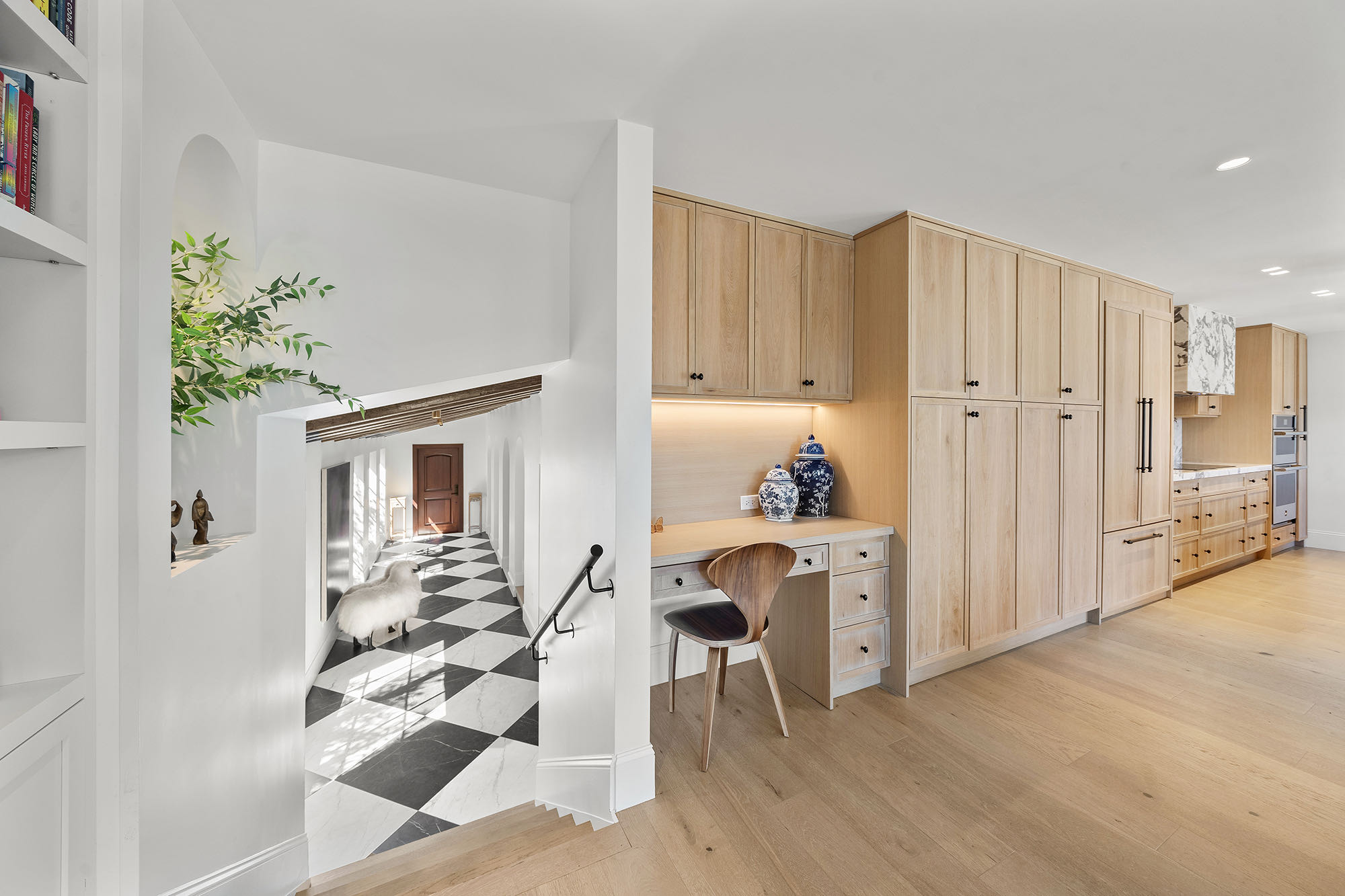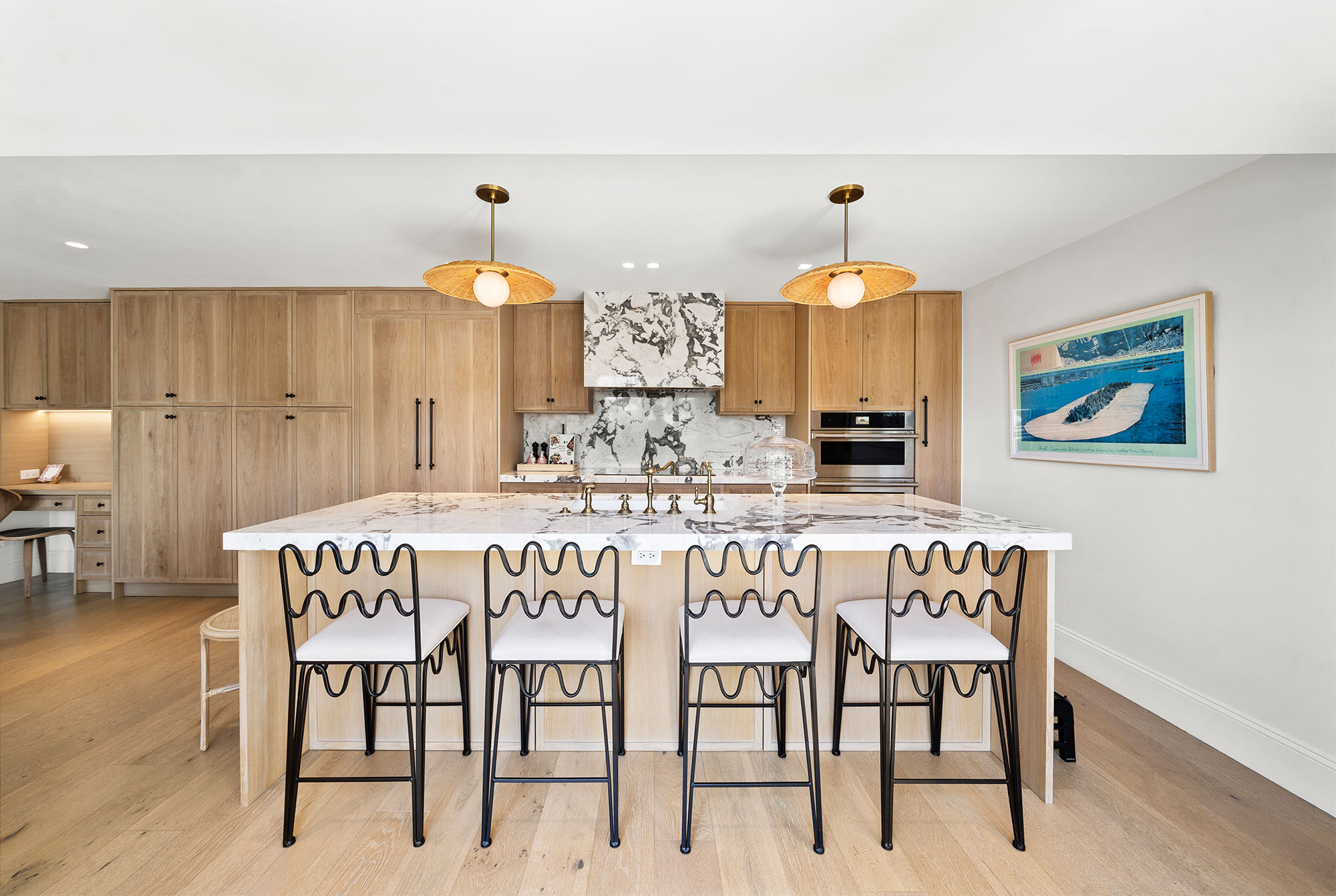 This spacious, fully remodeled two-story home (2,681 SF) blends modern elegance with high-end finishes. Filled with natural light, it features 3 bedrooms, 3 updated bathrooms, hardwood floors, porcelain tile in the hallway, terrazzo tile in the nursery bathroom, and Florida shellstone in the master bathroom. Redone in 2023 with new electrical, HVAC, plumbing, pool, and flat roof. Luxury touches include Italian doors, Ralph Lauren curtains, Sonos sound, and a marble kitchen island. The quartzite kitchen flows into the dining area, overlooking a fruit tree garden. French doors open to a deck & backyard with a pool and barbecue. Features security cameras, impact windows, landscape lighting, artificial turf & sprinkler system. Near the beach, Bal Harbour & A-rated Bay Harbor Schools.